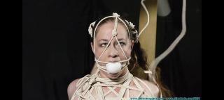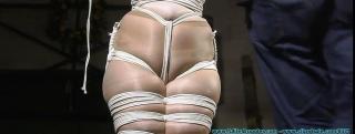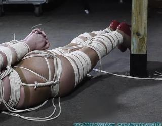 This clip starts where Part 2 ended... Peppers bountiful arms are tied next. They each get 25 feet of rope. More rope is used to bind her upper body, before I remove her neck rope and Pepper takes a seat so I can gag her. I use a homemade ball and add some face bondage as well. After that, Pepper goes on the floor where she'll be hogtied in Part 4.