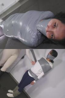 费尔南达有个保险箱,里面存放着她所有的钱和重要文件。她简直是莉莉卡的完美目标!莉莉卡从背后偷袭,一把抓住她。“什么……”莉莉卡捂住了她的嘴。她用胶带把费尔南达的双手分别绑在身上,然后用袜子和一大块胶带封住了她的嘴。费尔南达又气又恼!莉莉卡用胶带把她像木乃伊一样捆了起来,费尔南达根本动弹不得。现在莉莉卡可以自由地去拿保险箱了,而费尔南达则被困在那里,像个木乃伊一样。她完全无助!“呜 ...Fernanda has a safe box where she keeps all her money and important documents. She’s the perfect target for Liricaa! Liricaa sneaks from behind and grabs her. “What the… MMMMMMMMMPPPPPPPPPPHHHHHHHH!!!!!!!!”. Liricaa handgags her. She ties each of her hands individually to her torso with tape. Then she gags her with socks and a big tapegag. “MMMMMMMMMMMPPPPPPPPPPPPPPPHHHHHHHHH!!!!!!!!”. Fernanda is so angry and frustrated! Liricaa mummifies her with tape, is totally impossible that Fernanda can go anywhere. Now Liricaa is free to go for the safe box, while Fernanda is left there, mummified. She’s totally helpless! “MMMMMMMMMMPPPPPPPPPPPPPPPHHHHHHHH!!!!!!!!!”.