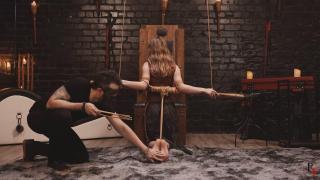 She is positioned with her back facing the viewer in a reverse pose: her arms extended along a thick bamboo pole, and her bare feet lifted and secured tightly to an overhead beam. From this point forward, Anna will endure a harsh bastinado session - 230 counted strikes - delivered almost exclusively with intense instruments, except for a few lighter ones at the very end.