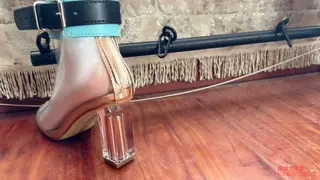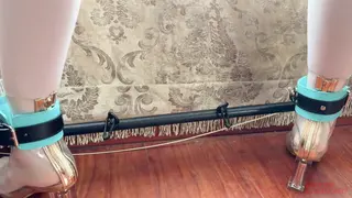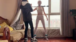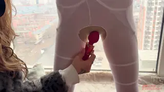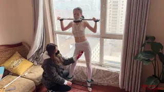 女孩面对落地窗,脖子和手固定在吸盘拘束架上,身穿几乎透明的蕾丝qq内衣,透明高跟鞋,双脚开腿器固定;一动不能动。窗外是一片密集的居民区,对面的居民楼近在咫尺,楼下的停车场车来车往,稍一定睛,就能看清对面人家晾晒的衣服,想必对面望向这里,也会把女孩暴露扭捏的姿态尽收眼底。水儿给她戴上假y口塞,绷带包嘴,只是每做一项,都会间隔几分钟,欣赏一会女孩羞耻窘迫的样子,看她越来越慌张,水儿又给她带上g勾,绳子连接脖子,女孩的反应更强烈了,原来是看到对面有人发现了她,盯着她看,既害羞又害怕但动弹不得,女孩只能拼命扭动身体,眼前是车流和居民楼,身后被大力的打屁股,玩够了水儿将她转过来,拿zd棒猛攻女孩的私密花园,连续墙高几次之后,把zd棒塞进女孩丝袜内,窗帘一拉就离开了,屋内只能看到来回飘动的窗帘,但对面有了窗帘的衬托,人形倒是清楚了好几倍,对外面的居民来说,真是天大的福利啊