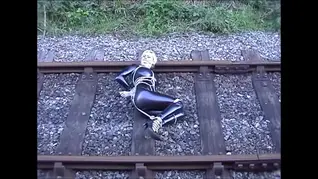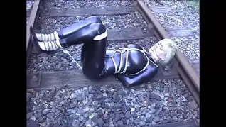 Rope bondage, cleave gagged, railway, black pvc suit,high heels, blondie, struggling, moaning, harnessed