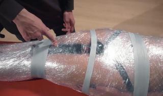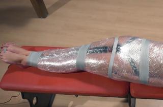 In this video, Darina Nikitina is tightly wrapped in film and tape. Under the film, there's Magic Wand vibrator, which is tightly applied to her pussy. Her big toes are tied, she's also ball gagged and her big tits are open. The video begins with how Masked man activates the vibrator and it begins to excite Darina - she loves vibrators a lot.