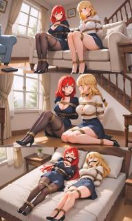 The next day, they arrive discreetly, faces half-hidden at first... then reveal themselves ready and willing. I bind them side by side on the couch with soft but tight rope: arms cinched behind, breasts thrust forward, ankles and thighs wrapped, emphasizing their curves and nylon-clad legs. Black cleave gags soon follow, muffling their excited moans into delicious "mmmphs". They squirm, test the bonds, eyes sparkling with anticipation.