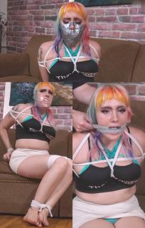 海莉嘴里塞了一条灰粉相间的条纹内裤,嘴唇上缠了一层透明胶带。While watching a movie featuring a scene with a bound and gagged woman, Hailey criticizes the ropework, saying she could easily escape something similar. Her friend challenges her to back up her words and prove her escape abilities. He’s sure to tie her up more securely than the woman in the scene and, before she can complain about that too much, he stuffs a gag in her mouth. He promises more gags if she can’t get free.