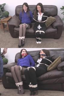 After the embarrassing bound tickling he leaves us to struggle in bondage. Paige does sofa bondage while I'm doing floor bondage, wondering what happens next?