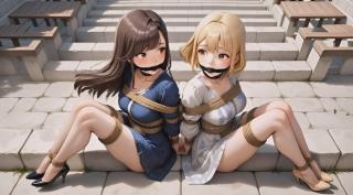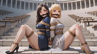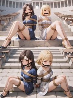 I can't resist. With soft but firm ropes, I bind their wrists behind their backs, wrap their waists and chests in tight coils that accentuate every curve, then secure their ankles and knees so they can only sit side by side on the sun-warmed stone steps. Black cleave gags silence their giggles, turning soft moans into delicious muffled pleas. Collars around their necks complete the picture – two gorgeous captives, perfectly displayed in this grand, empty amphitheater.