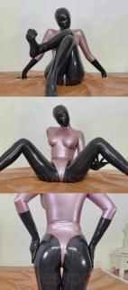 这部的小姐姐穿着——黑色胶裤袜+乳胶体操服+乳胶头套+乳胶手套。