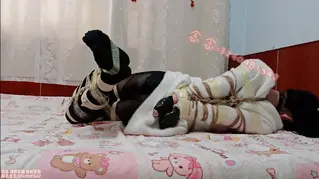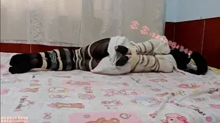 定拍的哥哥是想看一次很极限的捆绑挣扎,所以绑了一个直臂,腿和脚加起来绑了六处。嘴巴是用黑色胶带封住,后面还会用胶带把手也包起来,再到后面是加入了透明胶带,把身体和腿上没有绑绳子的地方全部加固,最后再把腿部折叠绑成驷马,脚掌也捆起来,总之应该能被绑的地方都被结结实实的绑起来了,貌似想不到其他地方了00..刚开始其实还没有很难受,但是直臂尤其是加上后面胶带包手的时候就有些受不了了,我一直不太喜欢包手,因为会很闷,并且也会感觉失去了最后一点可以活动的地方,本来就算被绑的很紧手指还是可以随便动就会有一些安全感,但是包手之后就完全没办法,最后开始绑驷马之后已经有点崩溃了,全程都在很卖力的挣扎(虽然没有任何作用就是了...)