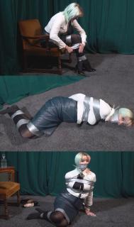 艾梅柏终于接受了如何应对被捆绑情况的训练。她仍然穿着保安制服——衬衫、领带、裙子和深色紧身裤,全身都被胶带缠住。她能逃脱吗?Amber finally gets some training in how to deal with a situation where you get tied up. Still in her security uniform of shirt, tie, skirt and dark tights she is taped up including a full tape wrap. can she escape?