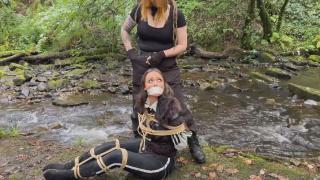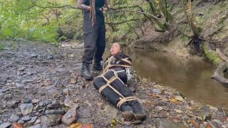 In a secluded clearing, she pulls a black hood over my head, soundproof and without eye holes, leaving me blinded, silenced, and completely helpless. Bound, gagged, and masked, I’m left to squirm in the darkness before she drags me away to my fate.