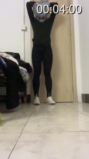 内容:小狗穿好服装,将手脚铐住,双手举起铐在房门上方,筋膜枪固定在下体狠狠的震动...