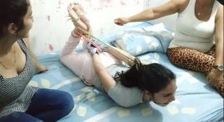 Hogtied Katherine is super frustrated now that her movements have been limited by the two dominant women holding her captive. The two women tie a rope around Katherine's ponytail to the back of her feet, limiting movement even more. They also tie Katherine's toes together and starts to have some fun whipping her exposed soles with a plastic stick - bastinado style!