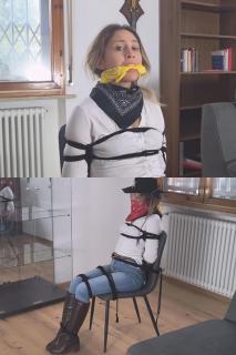 Miss Sofia, dressed in a white shirt, jeans, and boots, is tied securely to the chair with ropes and given a cleave gag! She tries to free herself, but is unsuccessful.