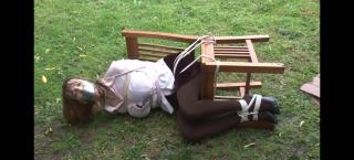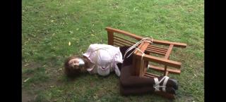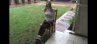女人被绳子捆在椅子上,嘴巴被胶带给封住,天上还下着雨,不一会的功夫身上的衣服就都被淋湿了~
