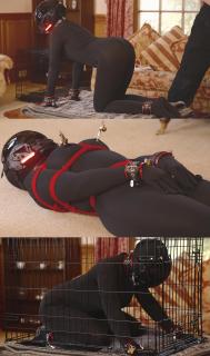 to her apartment and changes into a black outfit, going back later at night and avoiding the guards. She finds a room with one of the robots laid on a table, ready to be packaged up in a cage-like crate. She hears the guards coming and quickly realises there IS a way for her to find out what's going on. She strips the black leotard and control helmet off the robot and quickly takes its place! The unsuspecting guards duly package her up and deliver her to the rich pervert who the company is trying to bribe.