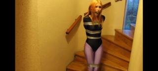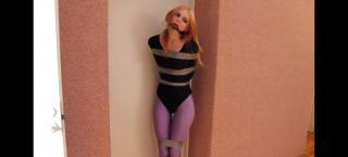 妹子被胶带束缚手脚在房间里跳来跳去,嘴里还塞着口球