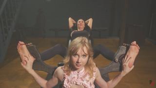 In this clip, the tall beauty is locked in the stocks, her big bare feet fully exposed and ready for attention. Today her tickler is Mandy - much smaller in height, which makes the visual contrast between them even more fun.