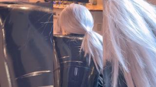 全頭マスクをつけたラバースーツのReIちゃんに着ぐるみマスクを装着!