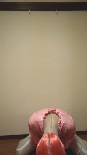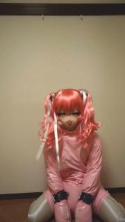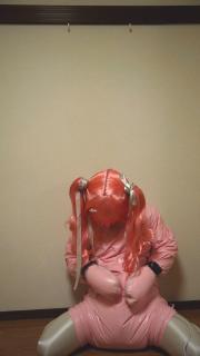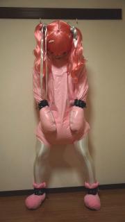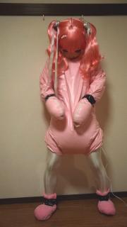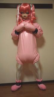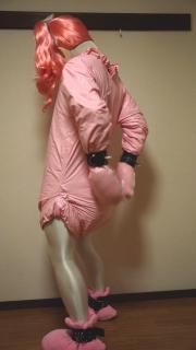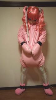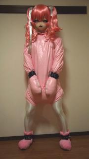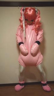 エナメルでできたモコモコのロンパースを着せられて、手も自由に使えず脚も閉じられず・・・