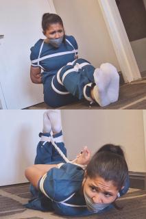 We now see Calisa in a hogtie in front of the door, where she remains till the end of the video. There's lots of frantic hogtie struggling and muffled moans and whimpers, with Calisa's beautifully expressive gagged face stealing the show. Just as the video is ending, she discovers she can reach one of the knots on her back and starts to pick at it. But would she be able to escape?