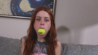 在之前的拍摄中,我们用网球作为填充物,但我最近没买网球,担心它会失去一些弹性。所以,贾斯珀往嘴里塞了一个全新的网球,以证明网球的弹性并没有影响她塞进去的能力。
