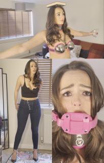 Then comes the heavy metal transformation: a full chastity metal bra locks over my chest, metal chastity panties cage secure my lower body, a thick metal collar clamps around my neck, and matching metal thigh bands are chained tightly together, restricting every step. I'm left in my signature Louboutin heels because, as he says, "You need balance and posture training."