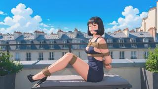 柔软的黑色口塞堵住了她轻柔的呻吟,但她闪亮的双眼和扭动的身体却诉说着真实的感受——她无比享受。她无助却又欣喜若狂,试探着绳结的松紧,愉悦地弓起背,透过口塞喘息着,温暖的阳光亲吻着她裸露的肌肤。每一次拉扯,每一次挣扎,都只会加剧她的兴奋;你可以看出她是多么渴望这种束缚、这种暴露、这种令人沉醉的无助。Watch my stunning anime-style Asian wife surrender completely to the thrill of tight rope bondage high above the streets of Paris. On our sun-drenched rooftop terrace, under a bright blue sky and surrounded by the iconic Parisian rooftops, she lets me bind her wrists, arms, and legs with coarse ropes that hug her curves perfectly.
