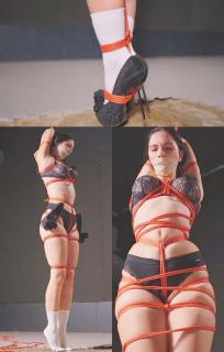 桑吉尼被捆绑得严严实实,胯部绳索勒得她难以忍受。她的脚踝、膝盖和大腿都被紧紧绑住。她的双臂被反绑在脑后,手肘并拢固定。胯部绳索勒得非常紧,从一开始就深深勒进了她的阴部。桑吉尼在这种紧紧的束缚下挣扎,试图穿着高跟鞋保持平衡。但这还没完!
