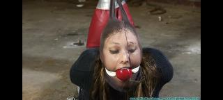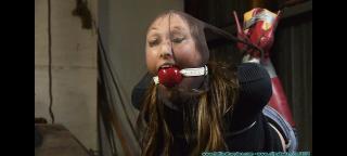 Originally Posted on 4-17-2023... Ophelia's bondage becomes much more severe and she seems to be enjoying the fantasy! hogtaped in floor, with a pantyhood in her head.