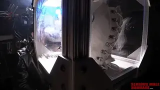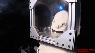 Ever since he built the head box it has reminded me of one of the Saw movies in which a man's head in locked in a similar box which is filling with water, and he must find a way to survive without drowning. The 80/20 head box doesn't hold water, but it does look cool and once your head is secured inside it is completely inescapable even with your hands free. It's fun to experience because you feel like you are in a fishbowl. You are on display, and yet you are separated from the rest of the room by the 1 inch thick transparent plastic. People can fuck with you all they want and there's nothing you can do about it. I'm sure we will have a lot of fun with the head box in various ways in the future. As a side note, the head box is extremely heavy and it took a lot of work to suspend it from overhead. Its height is adjustable to accommodate people of different sizes.