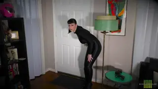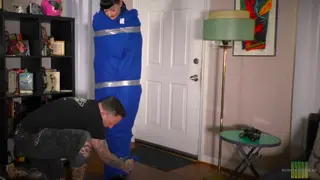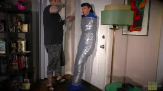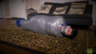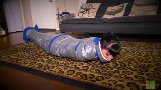 Cat burglar Nyxon has just broken into a house, and is beginning to snoop around. Suddenly, the owner of the house appears & demands to know what Nyxon is doing in his house. Nyxon stammers searching for something to say, but the man grabs her & starts wrapping duct tape around her securing her arms & her legs. He wraps her up in a fuzzy grey blanket, pushes her up against the door, & starts to tightly wrap her in duct tape. Next, he takes a blue fleece blanket, wraps it around the grey one & tightly wraps her in duct tape from her shoulders to her ankles. He then lowers her onto the floor, takes a large pair of white panties, shoves them into her mouth, and then wraps duct tape around her head. He then takes a large tube sock, ties that around her head & wraps even more duct tape over that. He then leaves her there to struggle on the floor in her very tight mummification.