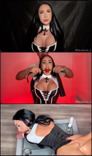 Come into the confession box, I’m here to listen to your deepest darkest desires, there is no judgment… wow I’ve never heard this before! Fantasising of grabbing woman tying, taping, gagging and stuffing their holes! Stretching their assholes with metal instruments! With a huge bright red ball gag in her mouth this nun is tied at the wrists and ankles. Bent over the table with her anal training toys lined up beside her. Her body being groped and explored her huge tits released from her top and her fat juicy naked ass exposed. She’s looked up and fondled, drooling endlessly.