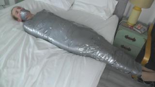 As she hops around helplessly in her rented apartment, the desperate detective can literally do nothing as her entire body is encased in the figure-hugging silver tape that squeezes her luscious body as if she were a tube of toothpaste... and for some strange reason, it seems to get tighter with every passing second!!!