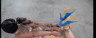 I continue to struggle as much as I can but as soon as Martin attaches my hair to my wrists, it gets a lot harder to toss and turn about. It tires me out each time I flip myself from one side to another but it doesn't stop me from trying! Then, Martin figures I'm pretty filthy from rolling around on the ground so what better way to help me out than to spray me down, right?! That ice cold water can be so painful but I don't mind it. I am thoroughly enjoying the feeling of being dirty, wet and completely helpless.