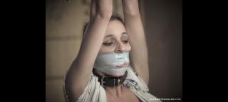 This episode starts where episode 4 ended. A shop rag is stuffed into Trixie's mouth and then sealed in with electrical tape. I make a few alterations to her shorts. I use her tits as a grab handle as I smack her ass. Her ass gets some attention from a thick leather strap, before I use electrical tape to bind her tits nice and tight. This is where Episode 5 ends.