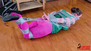 Librarian Minx presides over many a rare book, a job she takes very seriously. On this night, she was showing a book lover around the rare book section, explaining how a volume he wanted to see is off limits due to it's incredibly valuable nature. He isn't willing to take no for an answer, and binds and gags her in ultra sticky tape so she won't be able to prevent him from finding and stealing the book! Before he leaves to get it, he pulls her eyeglasses from her face, ensuring she'll be left in a blurry prison! Desperate to stop the man, Minx slowly and painfully works her way across the library to her bag, working to pour it's contents on the floor so she can get her phone and call for help! With her arms and wrists taped behind her back, making a call is VERY difficult, especially with her mouth sealed shut! Unfortunately for the poor librarian, the man finds the book he was looking for and returns with both the book and more tape! The poor girl is bundled up into a tight tape hogtie and is left to struggle until help arrives, but since it is late on a holiday weekend, she's going to have to wait for a few days before the staff returns!