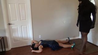 I open the door expecting to see my limo driver to take my to the opera, but instead there is a demanding amazon woman. Who are you I ask - the huge woman quickly takes control and shoves me backwards. She gets up in my face clamping a gloved hand over mouth and XXXX me to the wall "I am Sophia Stone and I've worked for you for five years" Suddenly she grips me in a XXXX hold and I cough and gasp kicking her away, but the room gets dark and down I go. I wake up handcuffed and cleave gagged on a chair with the dominant female looming over me. She strips off my gown and begins to fondle and touch my body. I beg her to remove the cuffs and she agrees to place them with my wrists bound in front. Sophia XXXX me to my knees and demands that I worship her feet. She ungags me and XXXX her stiletto high heel into my mouth and makes me lick and kiss the dirt off them. I am so humiliated, but the fear for my life overtakes me and I comply with her wishes. I sob and beg for mercy, but she plants her feet on top of my prone body using me as her footrest. The dominatrix begins to tire and I seize the opportunity to wiggle out from under her large body and I crawl around to the back of the chair. I place my cuffed wrists around her throat and XXXX the bitch out, but I am no match for her strength. The size disparity is tremendous and Sophia wraps her long legs around my neck squeezing tightly. I begin to loose air and I fall to my knees and down onto the floor. Sophia walks around me her tall giantess body looming over me and slowly she lifts her high heeled shoe and places it on my throat. The amazon woman presses harder and harder and I XXXX and gasp for air.