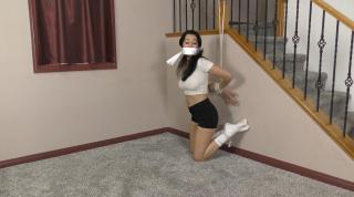 Kristen is once again a college detective, investigating missing young women. She decides to sneak into the suspect’s house but gets grabbed just as she finds some incriminating evidence! Now bound in her spandex workout shorts, a sexy crop top and white Nike socks, she struggles bound to the staircase, gagged, & blindfolded, before her captor decides to move her to a more secure location.