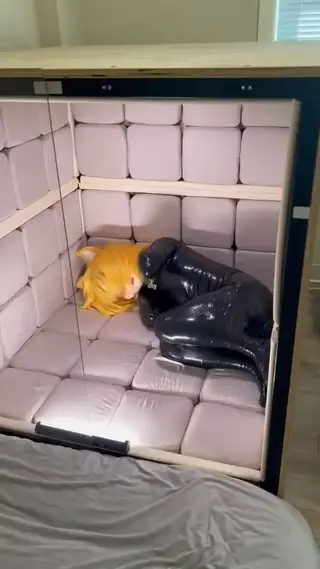 书接前回,狗狗从运输箱出来之后,在饲主的指引下,一步一步摸索着,爬进了自己的长期饲养箱!这里就会是狗狗的新家了~