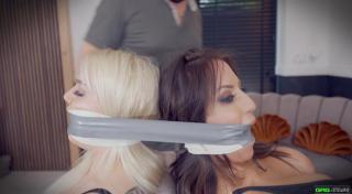 Story Charlie & Luna are talking about bondage and thinking about how it would feel when suddenly the screen dips black. They are both tied on the chair not knwoing what exactly has happened to them. Before they know a guy with a mask comes in and wrap gags them both. They struggle in the bondage and MMMMPPPPHHHH trough their gags. Their hearts race with fear as they desperately try to communicate with each other through their muffled sounds. The unknown presence in the room only intensifies their anxiety, leaving them wondering what the masked man's intentions are and if they will ever escape this situation. After a while their gags are replaced for tight microfoam cleave gags making it impossible for them to speak but they sure try to making muffled gag talk sounds. They are enjoying the gags while having a complete new experience. As time passes, the intensity of their fear begins to wane, replaced by a strange sense of curiosity and intrigue. Despite their inability to communicate verbally, they find solace in the shared experience and the unexpected thrill of their predicament. Each muffled sound they make becomes a form of secret communication, a silent language that binds them together in this surreal moment. To add another layer to their predicament their captor adds a duct tape cleave wrap to get them both connected back to back. They continue to struggle in their bondage while heavily gagged with no chance of escaping. As time passes, the intensity of their struggle only grows, fueled by their determination to break free from their captor's clutches. With each futile attempt to loosen the tight restraints, they feel a surge of adrenaline and a renewed sense of unity. The silence that envelops them becomes a powerful reminder of their shared strength and resilience, as they silently vow to never give up until they regain their freedom.