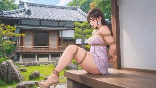 她耐心地在静谧的寺庙庭院中等待着,微风轻拂着她裸露的大腿,她优雅地弓着身子,展现出一种克制的姿态。当他终于到达时,看到美艳动人的妻子被巧妙地捆绑着,宛如一件活生生的艺术品,他的欲望瞬间被点燃。他缓缓走近,细细品味每一个细节,然后温柔而坚定地将一块柔软的布塞进她张开的嘴里,用紫色的丝线紧紧地系住她的嘴,堵住了她兴奋的呻吟,让他得以享受这份惊喜。In the serene glow of a traditional Japanese garden, a devoted wife decides to surprise her busy husband with the ultimate gift of submission. Dressed in delicate lavender silk lingerie that clings to her curves, she contacts a professional rigger to bind her perfectly in intricate shibari ropes. The expert ties her arms behind her back in a secure box-tie, wraps beautiful diamond patterns across her chest and hips, then secures her long legs with tight coils that leave her helplessly displayed on the tatami mat.