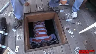 【中文】被电钻固定在院子里一整天,晚上解开时谈感受。最后因为四肢僵硬被工作人员扛进了屋子里。The "bring everything tour" continues with a classic bondage suit laced tightly over a tight neoprene wet suit then bolted down with twenty five pounds of metal. This extreme bondage involved a lot of team work. The simple fact is that the suit was restrictive enough to keep our prisoner in check, but what the hell we had the technology and power tools.