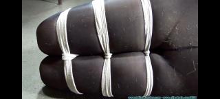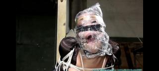 This clip starts where Part 2 ended... The masked man re-positions her on the floor. Riley is left on the floor by herself momentarily, but the masked man soon returns. He wastes no time severely hogtying poor Riley. A stream of drool connects her lips and a puddle on the floor, as she is arched back. He then uses clear tape to wrap around her head and then he continues taping back to her feet and then back around her head, pulling her head back as far as possible. As if she was ever going to get away before, the odds are 0% now. Riley can move her fingers and twitch a little, but that's about all her bondage will allow. She's left on her stomach for quite a while, but eventually the man returns and rolls her onto her side. He leaves her to moan and endure her stringent bondage once again. At the end of the clip he returns.
