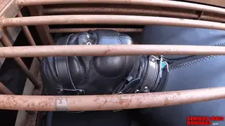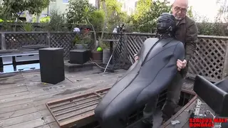 【中文】木乃伊待在地牢里的一天纪实。Mumman is a bondage marathoner. His style of mummification combines complete tight layered coverage and time. On this occasion he wanted to try out our new deck standing cage. The San Francisco weather had cooled and warmth was an issue so a double layer of neoprene was in order. The leather isolation hood we used was his. It fit like a glove from years of regular use. The hours passed as the temperature dropped. The added compression of the double layers eventually took a toll on his circulation so the scene had to be ended. His goal of overnight is still out there but this was a gallant try. The look on his face was a sign that his long isolation was still well worth the effort.