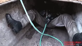 【中文】防化服在铁笼和地牢里。Zodiac Hazmat suit was all I heard about the previous days of Bondage Vienna's visit after Dore Alley. I finally asked to see it and was blown away by its potential to produce sweat. I love dry and wet saunas myself after living for many years in the hot desert. We both remembered the times we climbed into our attic of my parents' house or the top loft of a neighbor barn on a hot summer day. I was fond of spraying water on the inside walls of the canvas family tent in the back yard which he never thought of. We had this in common along with heavy bondage so this really worked out. I had hoped he would stay another day so I could spend some time in this walking sauna suit myself. I understand it is designed for hazardous conditions, but the sweat factor is a fetish I understand. Maybe next time but for now we can only share this guy's hot sweaty pleasure.