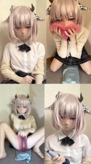 素体玩偶身着肉色全包紧身衣并头套全包裹的恶魔奶牛魅魔头壳,外搭JK女高水手服衬衣毛衣外套和短裙,裙下的是色气的开裆情趣内裤,硕大棒棒饥渴难耐,后庭肛门还有震动玩具...娃娃拿出橡胶触手片模拟触手play刺激棒棒,之后用手handjob和震动棒满足自己,在阵阵娇喘呻吟中到达强高潮顶点...