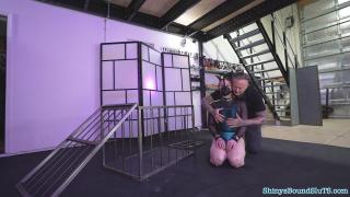 Shiny's commands are clear and authoritative, directing Kammy to her knees and then enfocing her submission with a steel collar and cuffs all padlocked in place. The puppy mask ball gag mutes her whimpers, and she is the commanded to enter the tiny steel cage.