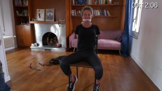 Clueless Alba is talking on her phone, so she doesn’t hear anything. Alba is dressed casually in jeans, a sweater and athletic shoes. Her hair is down. The camera cuts back and forth a few times to a frustrated, struggling and handgagged Eleonore to a cheerful, clueless Alba. Tony quietly admonishes Eleonore for not telling him that she had a roommate. He knows he has to take control of Alba as well. She struggles as best she can, but he is too strong so he leaves her bound and gagged.He goes looking for Alba. Alba finishes her phone call, he grabs her in a crushing handgag and explains why he is doing what he is doing. He tells her that he already has Eleanor tied up and he will have to do the same with her. She struggles but he is too strong and he gags her with a thick double gag and tells her to undress. The busty woman does as told and we see that she is wearing sexy black underwear.