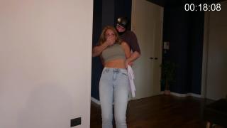 Eleonore is out in the living room, wondering what’s taking our client so long, so she goes to the bathroom door and knocks. He immediately opens the door, spins her around and grabs her in a vicious handgag, squeezing her face. She tries to pull his hand down from her mouth, but he is too strong, and he finally ends up, pinning her arms behind her back. He essentially tells her his plan, that he is going to break into the neighbor’s house as soon as they leave and he will just have to keep her quiet until that happens. She tries to talk through the handgag, so he blocks her mouth as well until she calms down. He tells her that he will need to try a few different gags on her to determine which one will keep her quietest.