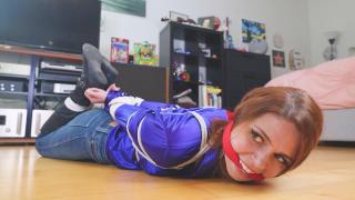 米娜·萨洛梅正在寻找她被绑架的失踪朋友。她比警察聪明,抢在他们之前找到了坏人的藏身之处。然而,进去之后她却找不到朋友。相反,她却遭到袭击,被人从背后抓住并捂住了嘴。坏人告诉米娜,他已经救出了她的朋友,正准备逃走,但现在他得先解决掉她。坏人把米娜紧紧地绑了起来,双手反绑在背后,然后用一个开口器堵住了她的嘴。最后,米娜被五花大绑,姿势极其屈辱。她只能这样待上一整天,因为她根本无法逃脱,唯一的出路就是被人救出来。Mina Salome is looking for her missing friend who has been taken captive, she is smarter than police so she finds the hideout of the bad guy before they do, but once inside she can't find her friend. Instead she gets surprised, and grabbed from behind with a handgag. The bad guy explains Mina that he already freed her friend and he was ready to flee but now he has to take care of her. The bad guy ties Mina tightly, hands behind her back, then gags her with a cleave gag. Finally, Mina gets hogtied, a very humiliating position, she'll spend the rest of the day there since escaping is impossible, and her only way out is to be rescued